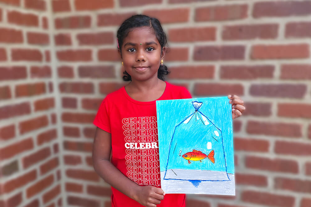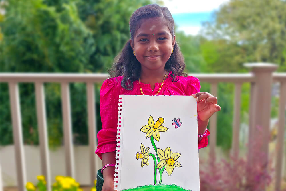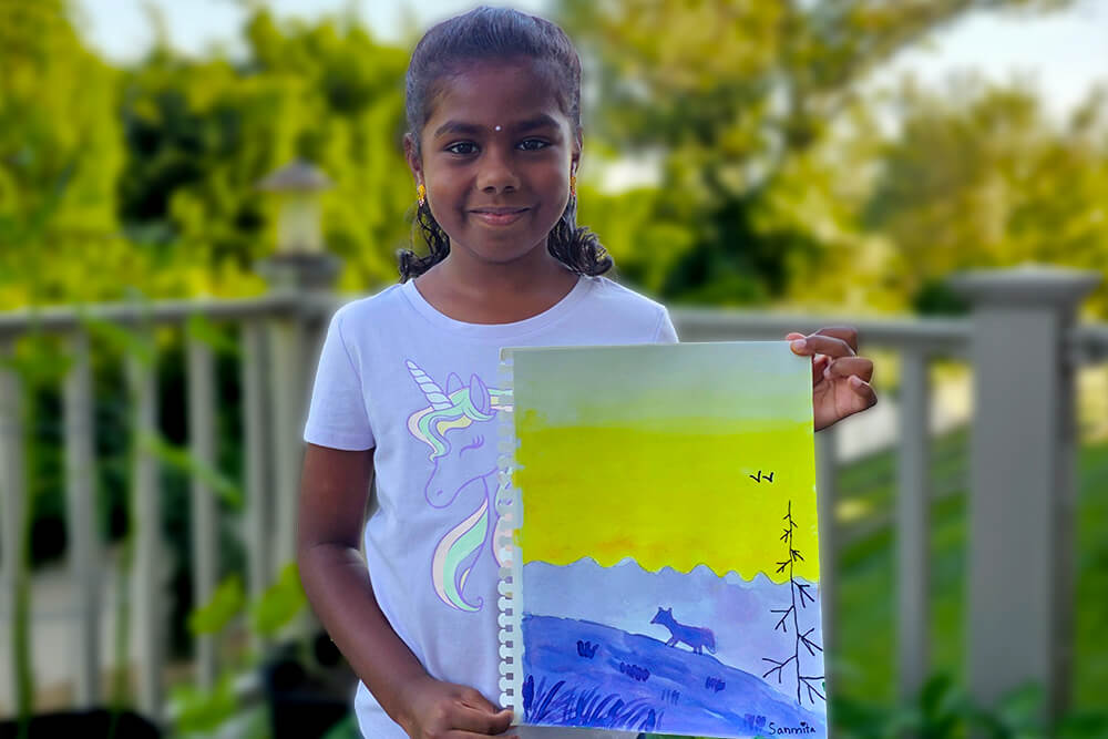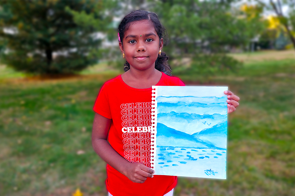 Meet Sanmita Muthukrishnan, a bright young artist whose creativity blooms from her love for nature and family. Her curious eye and joyful heart bring her artwork to life through gentle colors, detailed brushwork, and imagination. At just seven, this young artist finds joy in every little thing around her. When she’s not painting or drawing, Sanmita loves swimming, solving jigsaw puzzles, and playing with her sister. She also enjoys spending time outdoors with friends, helping her mom in the garden, and capturing nature’s beauty through her camera lens. With a big imagination and a caring heart, Sanmita dreams of becoming a nature photographer, combining her love for art, animals, and the world around her.